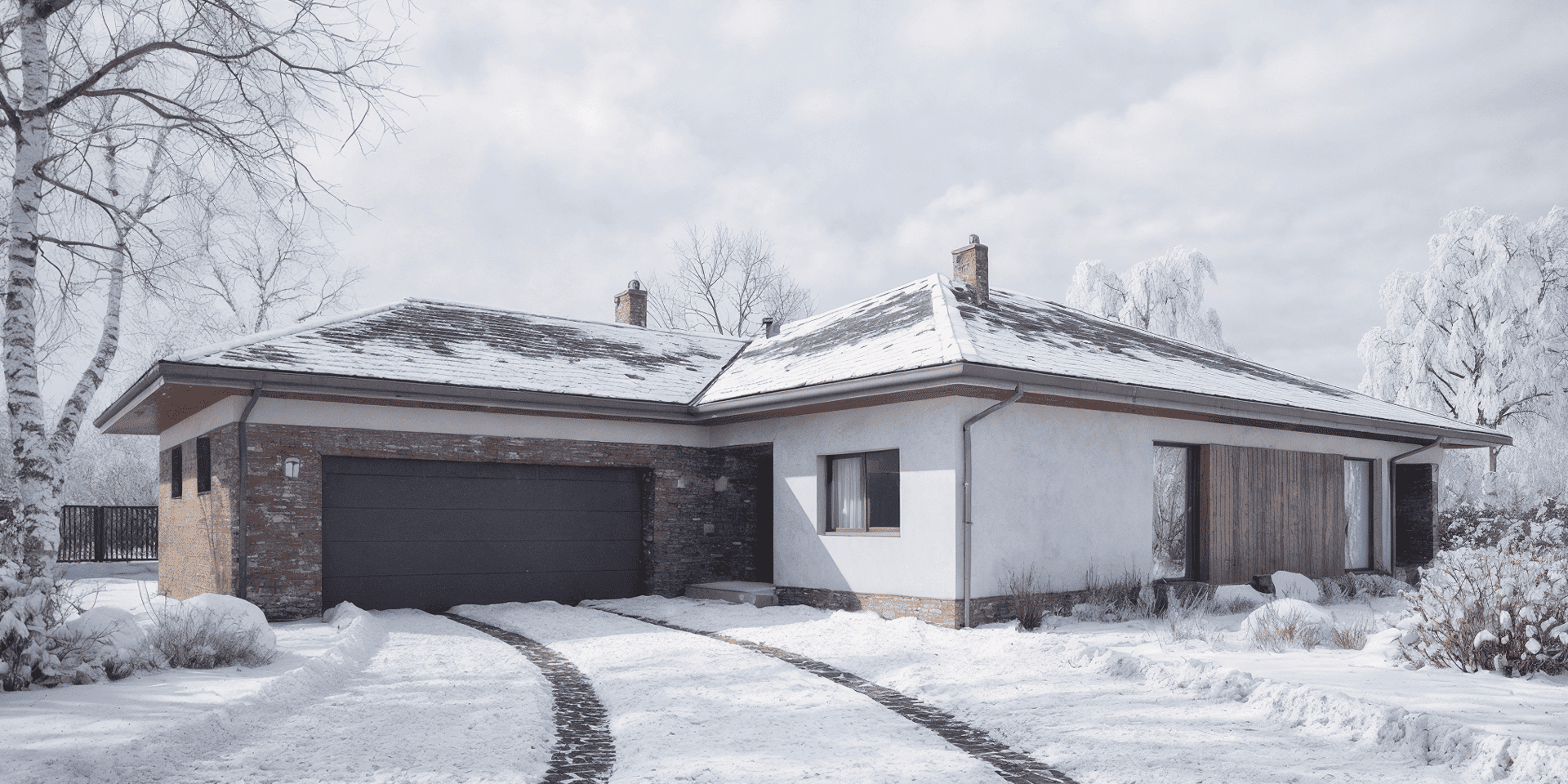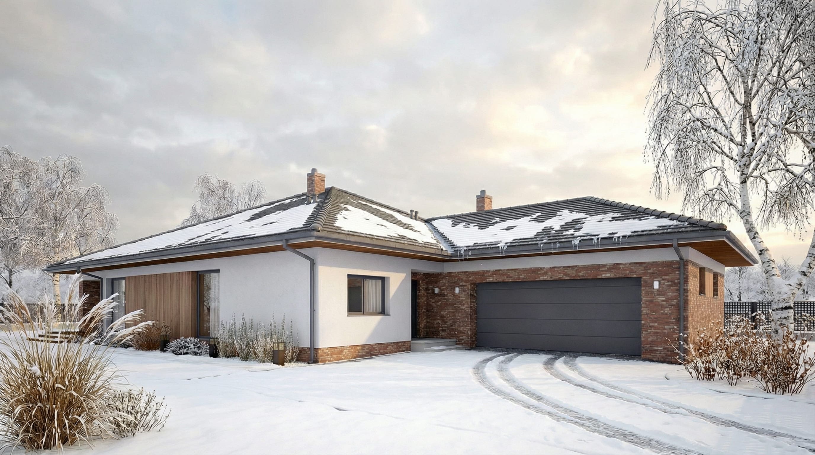 Stolarka okienna i drzwiowa: okna i drzwi PVC, rolety zewnętrzne, brama garażowa segmentowa.
