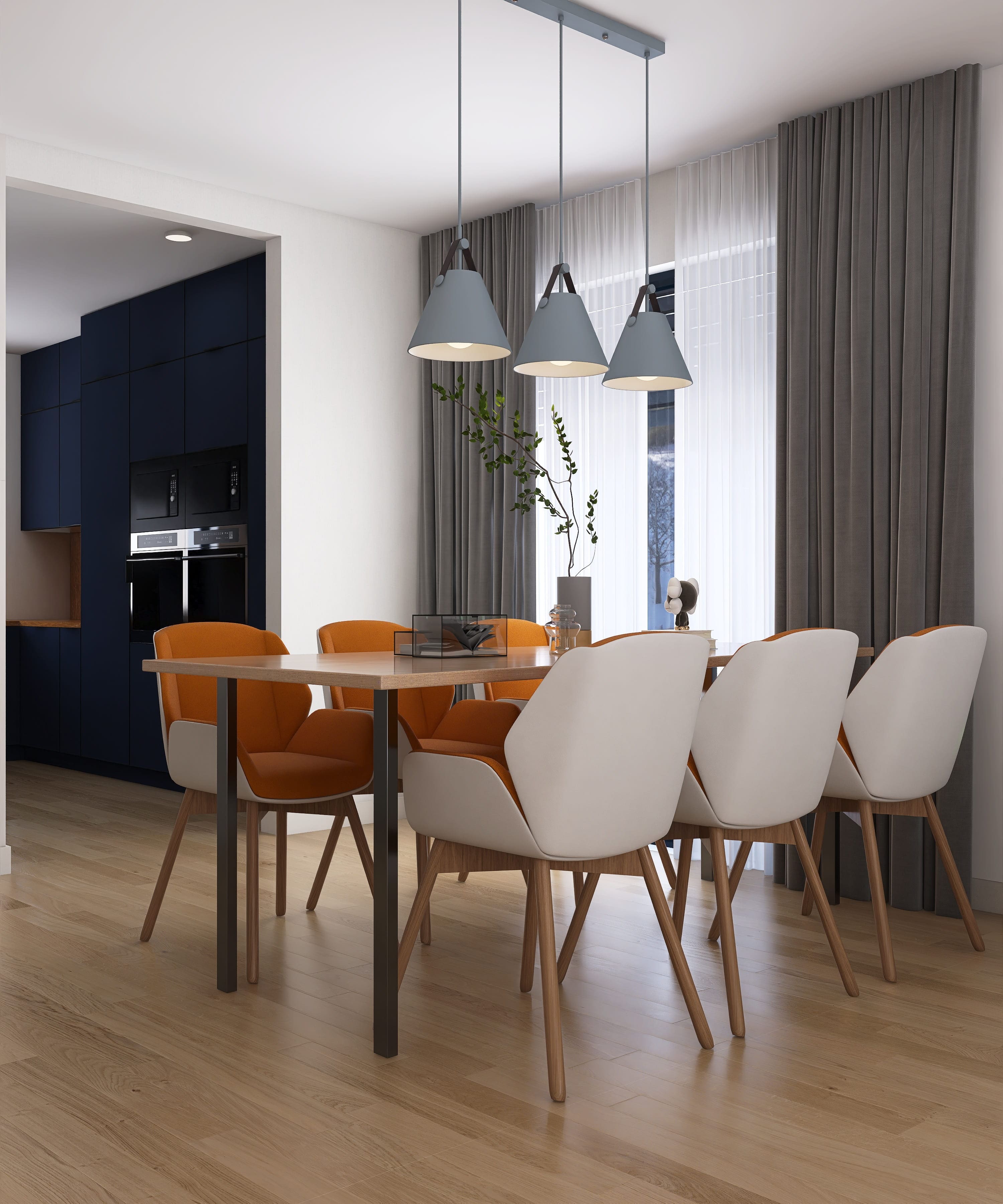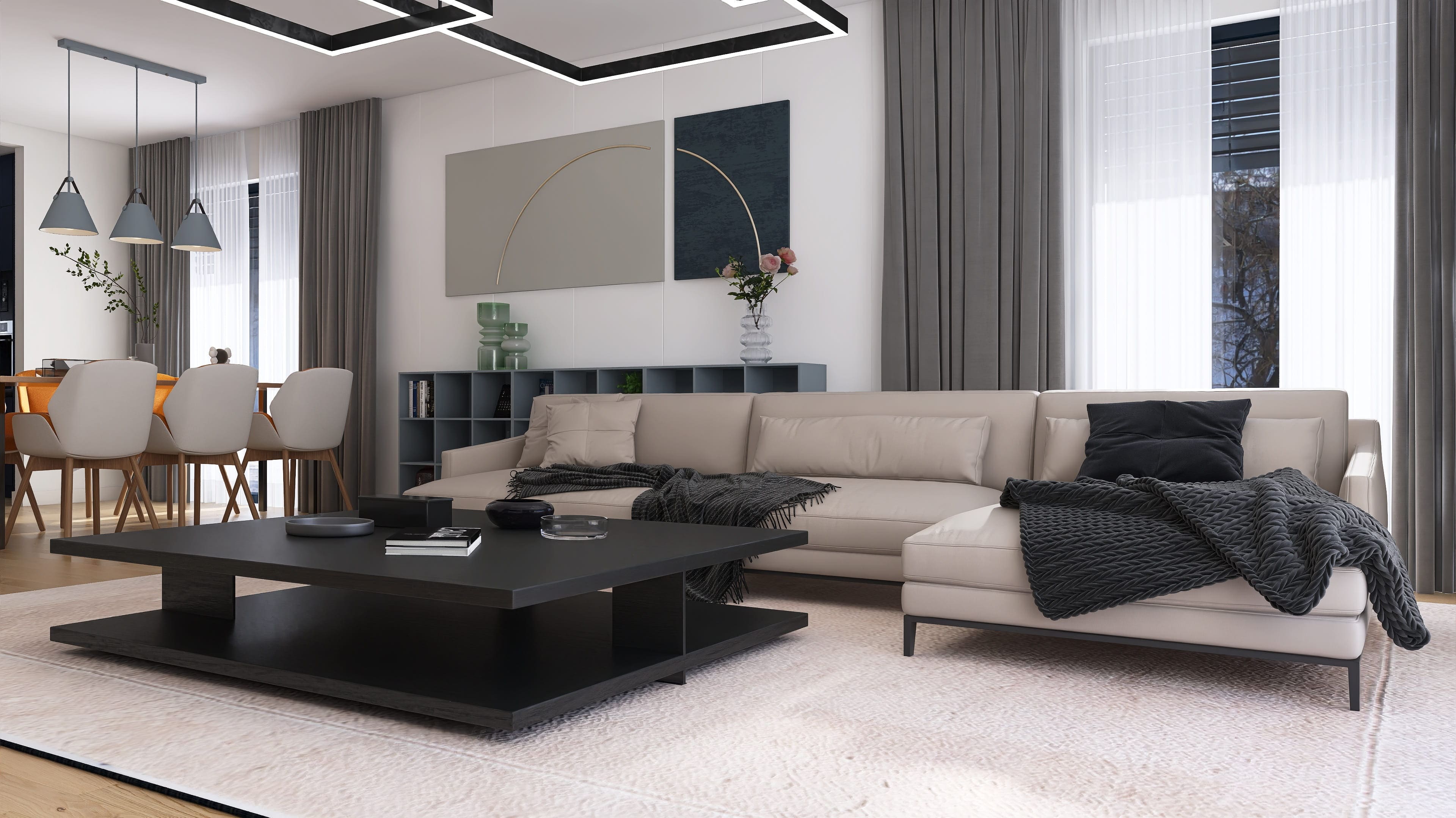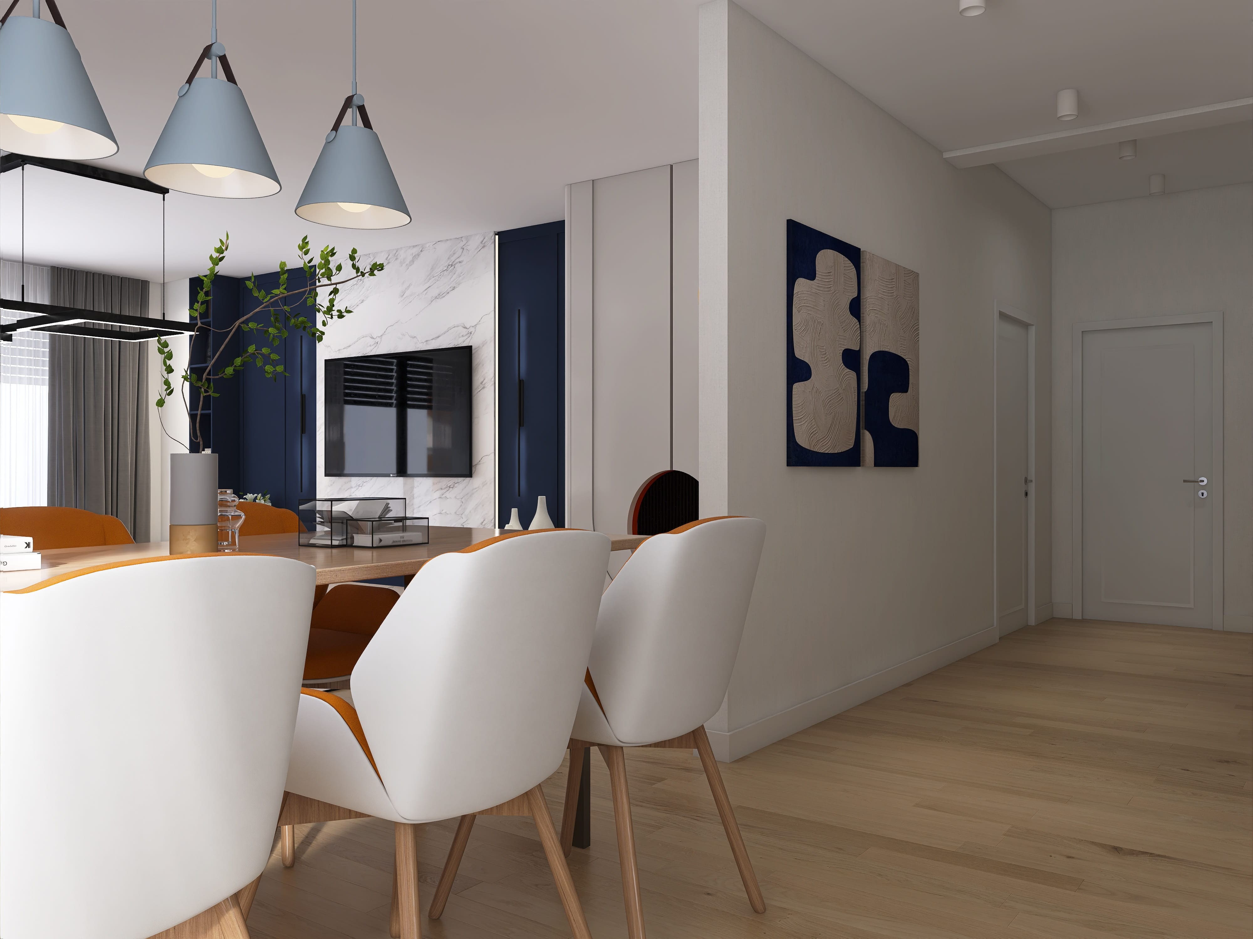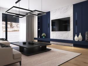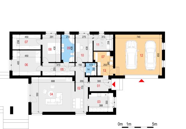 Salon z jadalnią, kuchnia, cztery pokoje, dwie łazienki, garderoba, pomieszczenie gospodarcze z pralnią, garaż.