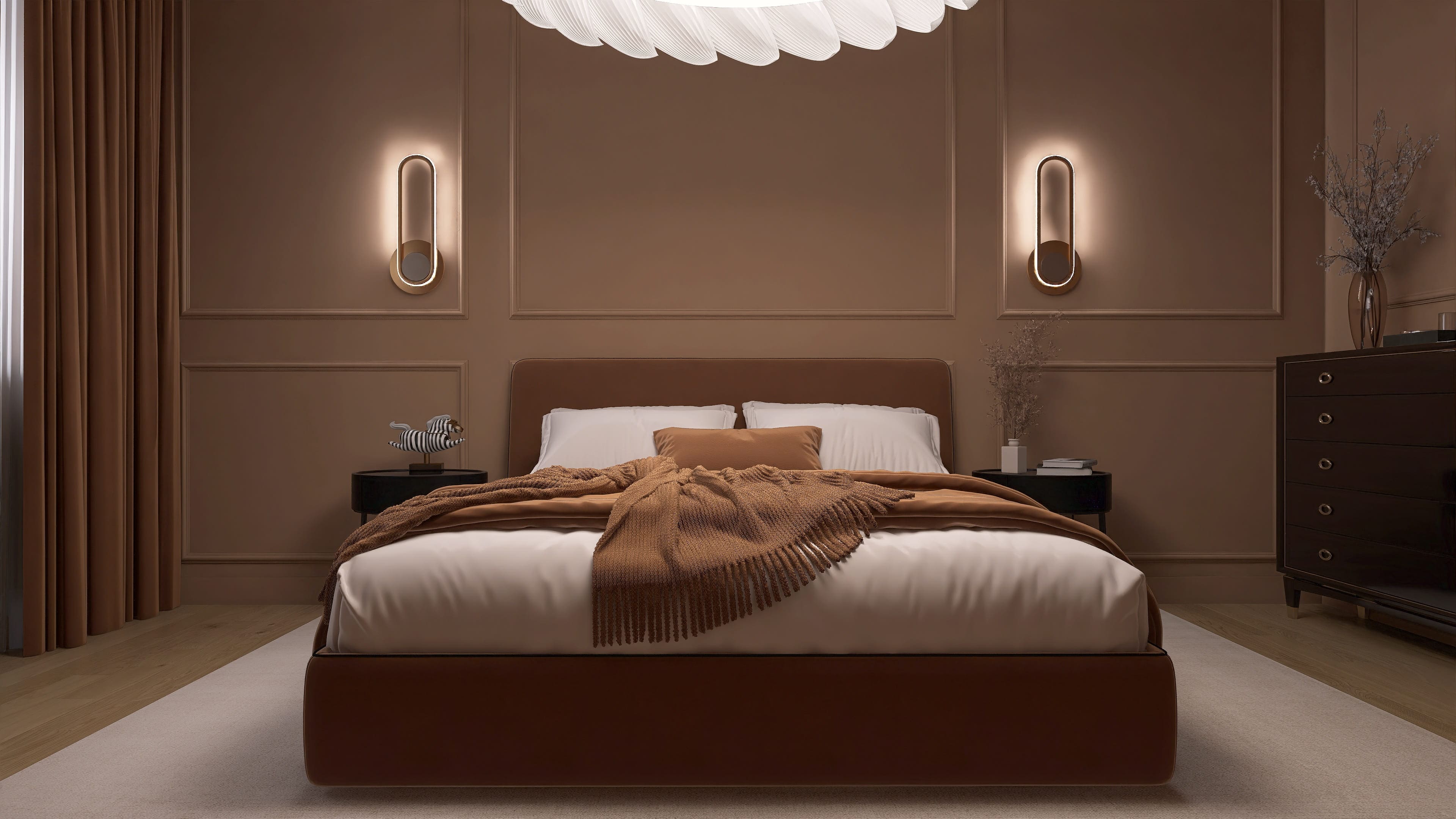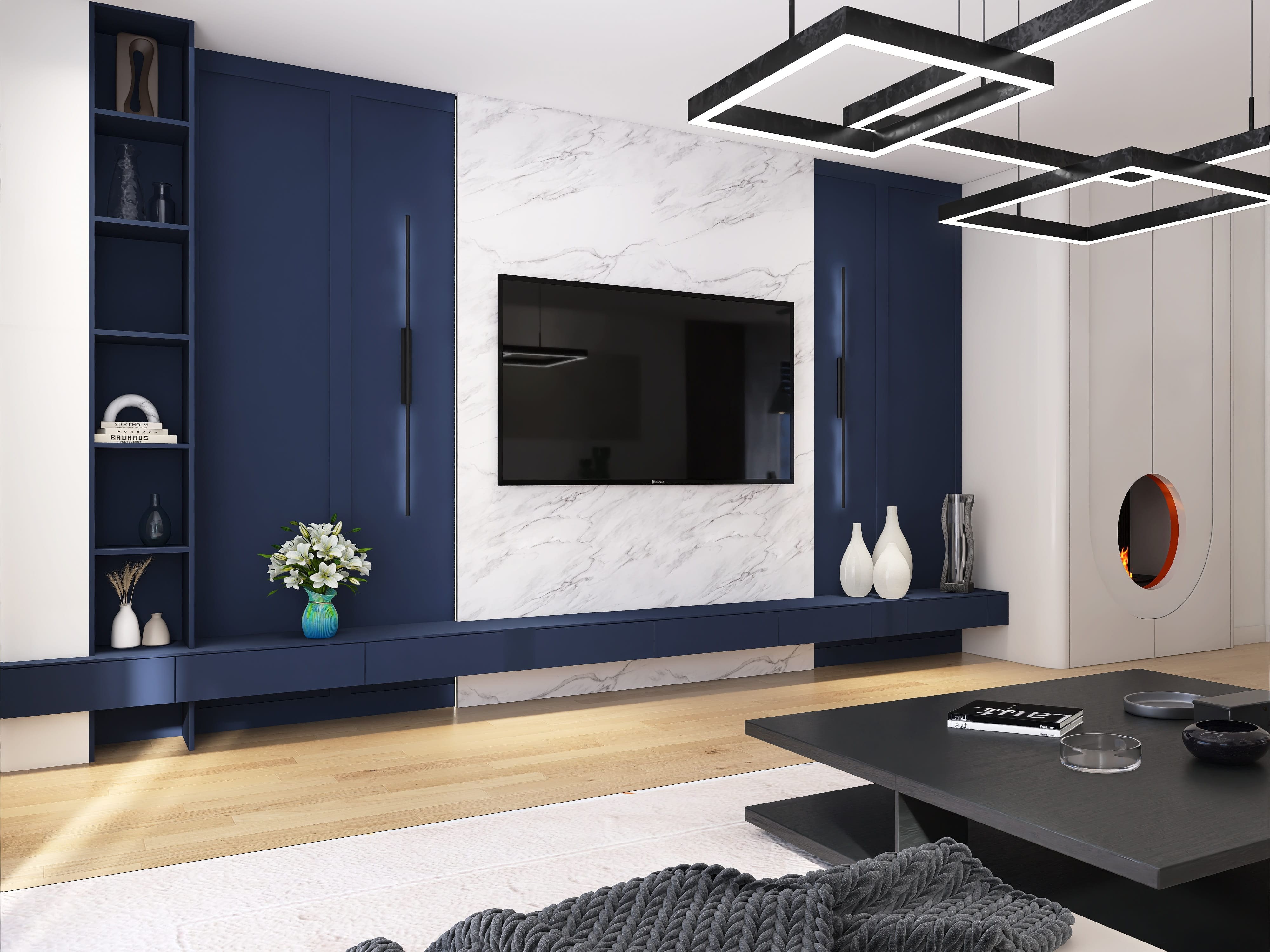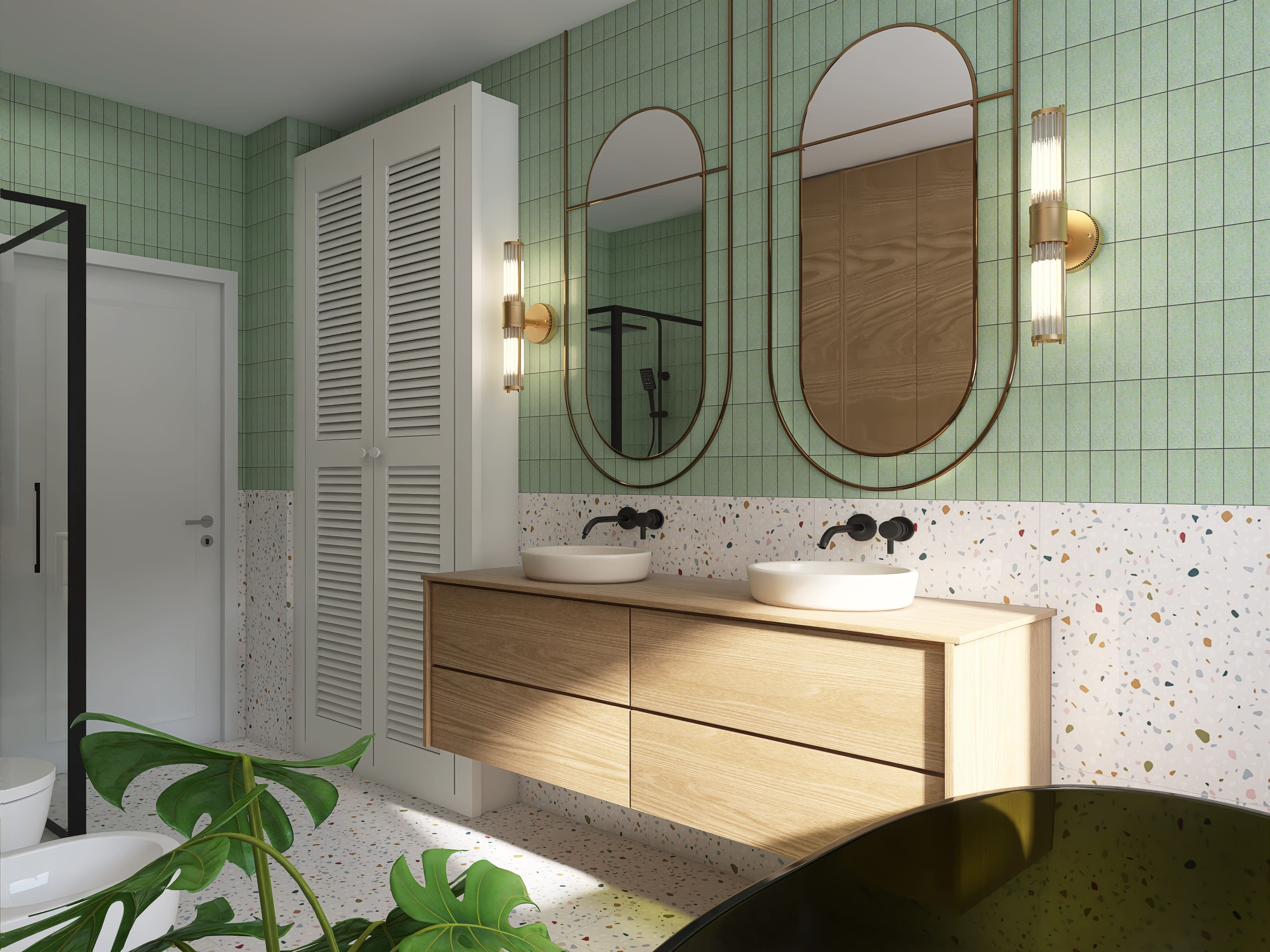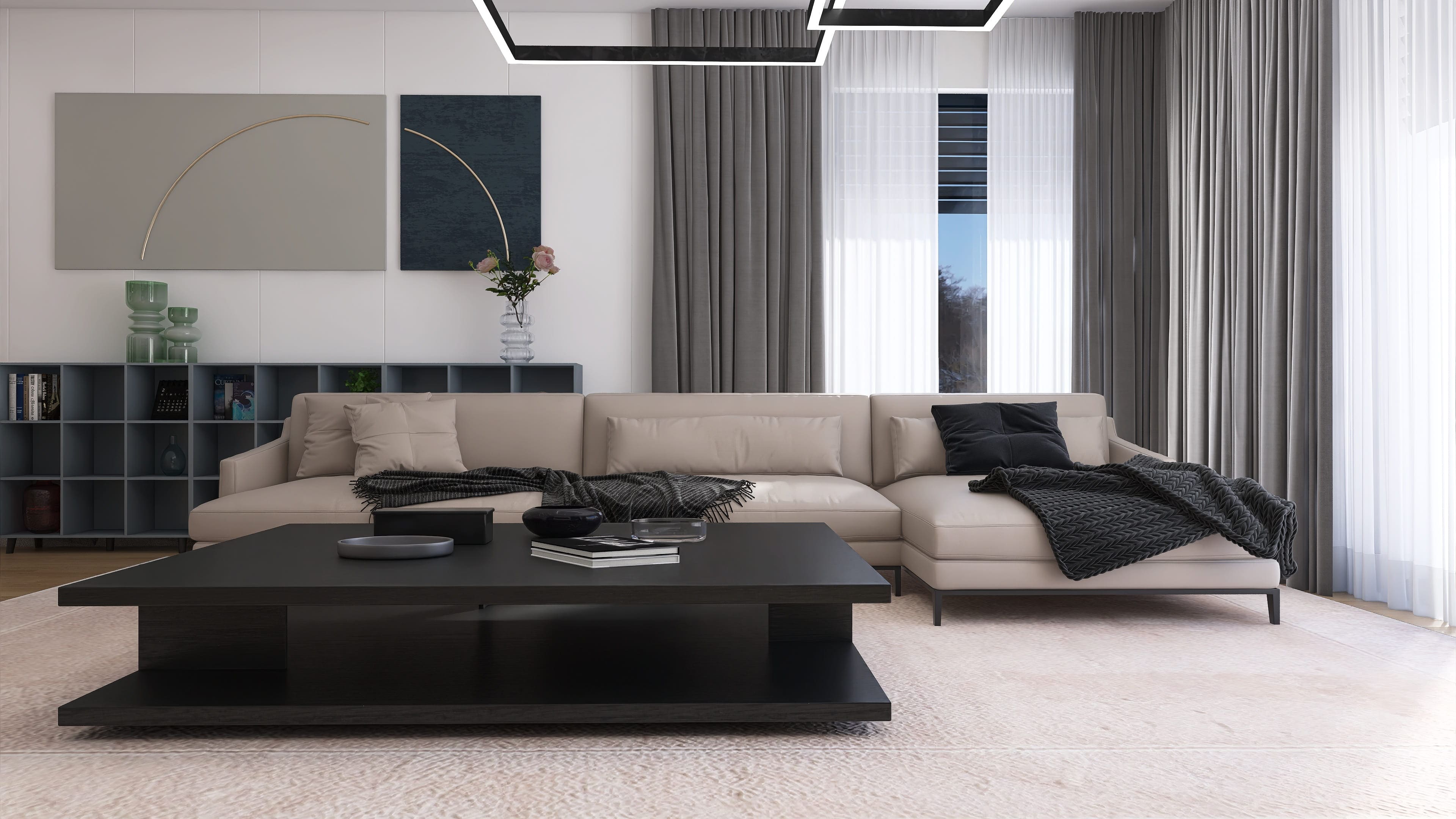 Salon z jadalnią, kuchnia, cztery pokoje, dwie łazienki, garderoba, pomieszczenie gospodarcze z pralnią, garaż.