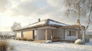 Źródło ciepła: kocioł gazowy, kominek z płaszczem wodnym na biomasę i zestaw solarny (c.w.u.). Pomieszczenie gospodarcze spełnia wymagania kotłowni na paliwo stałe, w związku z czym na etapie adaptacji istnieje możliwość zmiany sposobu ogrzewania.