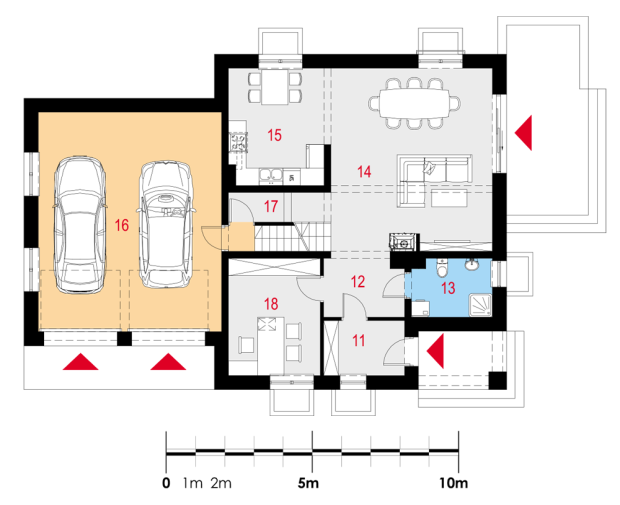 Salon z jadalnią i wyjściem na taras, pięć pokoi, kuchnia z jadalnią, trzy łazienki, dwie garderoby, garaż dwustanowiskowy, cztery pomieszczenia gospodarcze.
