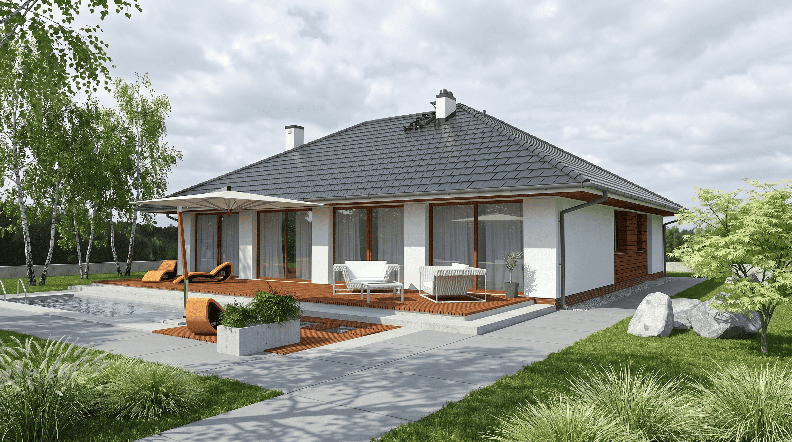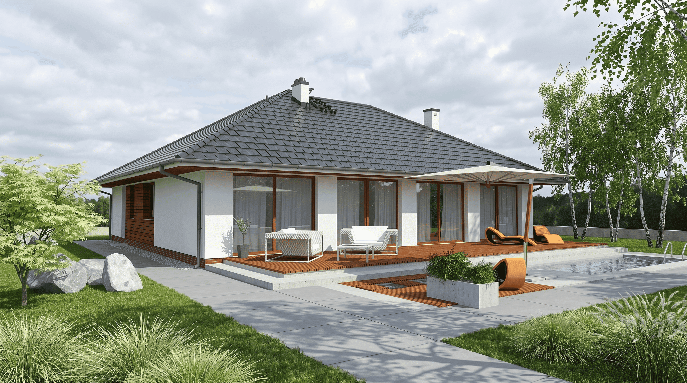 Salon z jadalnią i wyjściem na taras, kuchnia, trzy pokoje, trzy łazienki, WC, garderoba, ogród zimowy, pralnia, siłownia, przebieralnia, sauna, jacuzzi, trzy pomieszczenia gospodarcze.